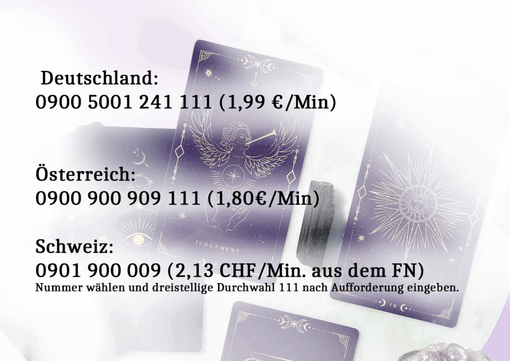 Neben dem Kartenlegen fließt auch meine Hellsicht in jede Beratung ein. Schon seit meiner Kindheit bin ich besonders sensibel für Energien, Stimmungen und die geistige Welt. Diese Fähigkeit setze ich ein, um über die Karten hinaus zusätzliche Informationen zu empfangen. Oft zeigt sich dadurch ein noch genaueres und vollständigeres Bild.